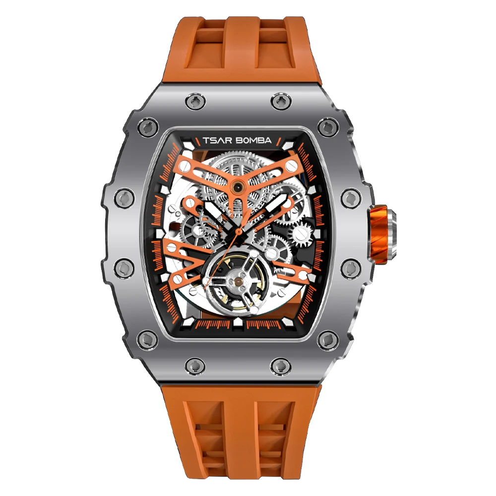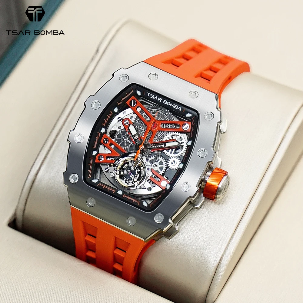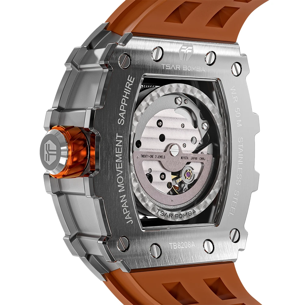 For TB8208 Tonneau Case Miyota Automatic Mechanical Watch Stainless Steel Sapphire Crystal 5BAR Water Resistant Silicone
